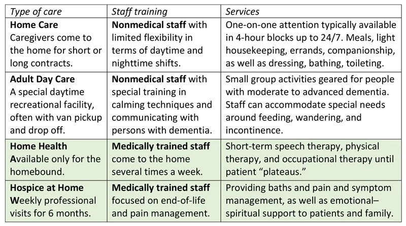 Support is available for those who wish to stay at home. However, one-on-one care is expensive. And it’s not always easy to find caregivers. Community services can sometimes be patched together.