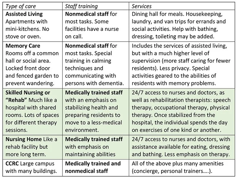 Skilled nursing or “rehab." Geared for short stays—several days to several weeks—a skilled nursing facility can be thought of as a place to get stronger or learn to do things in new ways after a setback. Then you move to a more homelike environment.